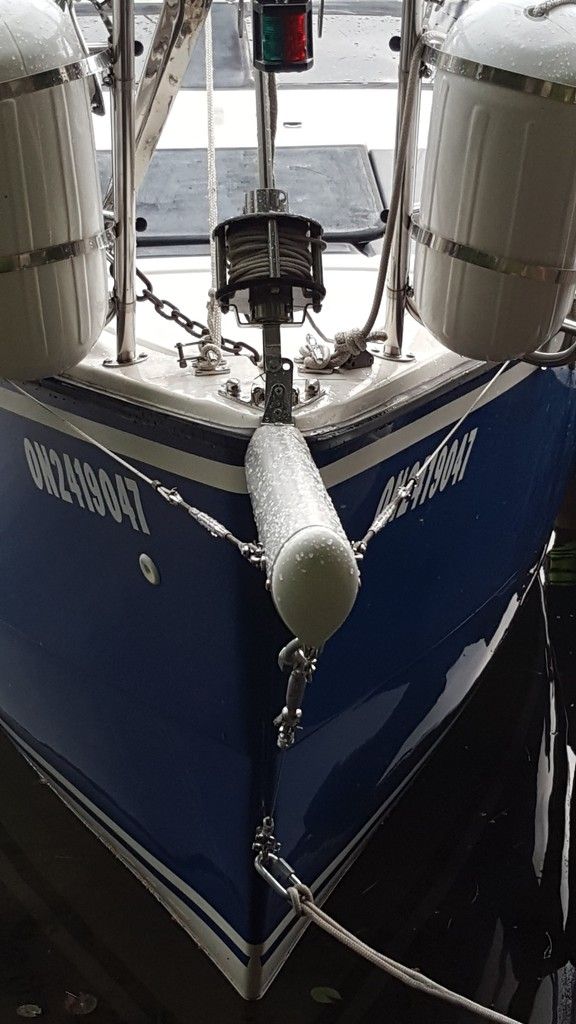 I've just completed the first mod with a fitted and hinged section of my old hardware. I think the hardest part was accessing and removing the bow roller hardware. Right now, the next (and last) thing to be done is fabricate and attach another fore-stay to a second mast hound somewhat above the original. It was important to me to be able to quick release the haul-down as we frequently go in canal locks with other boats. And it also has to be done when using the trailer.